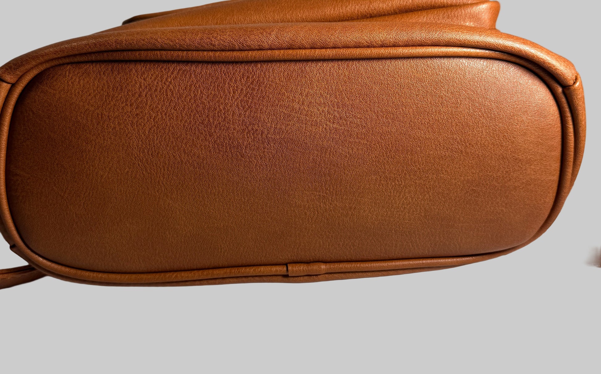 Faux leather fabric lined backpack. Foldover magnetic snap closure. Interior zipper and two pouch pockets. Adjustable shoulder straps. Dimensions: 10 1/4"(L) x 4 1/4"(W) x 13 1/2"(H)