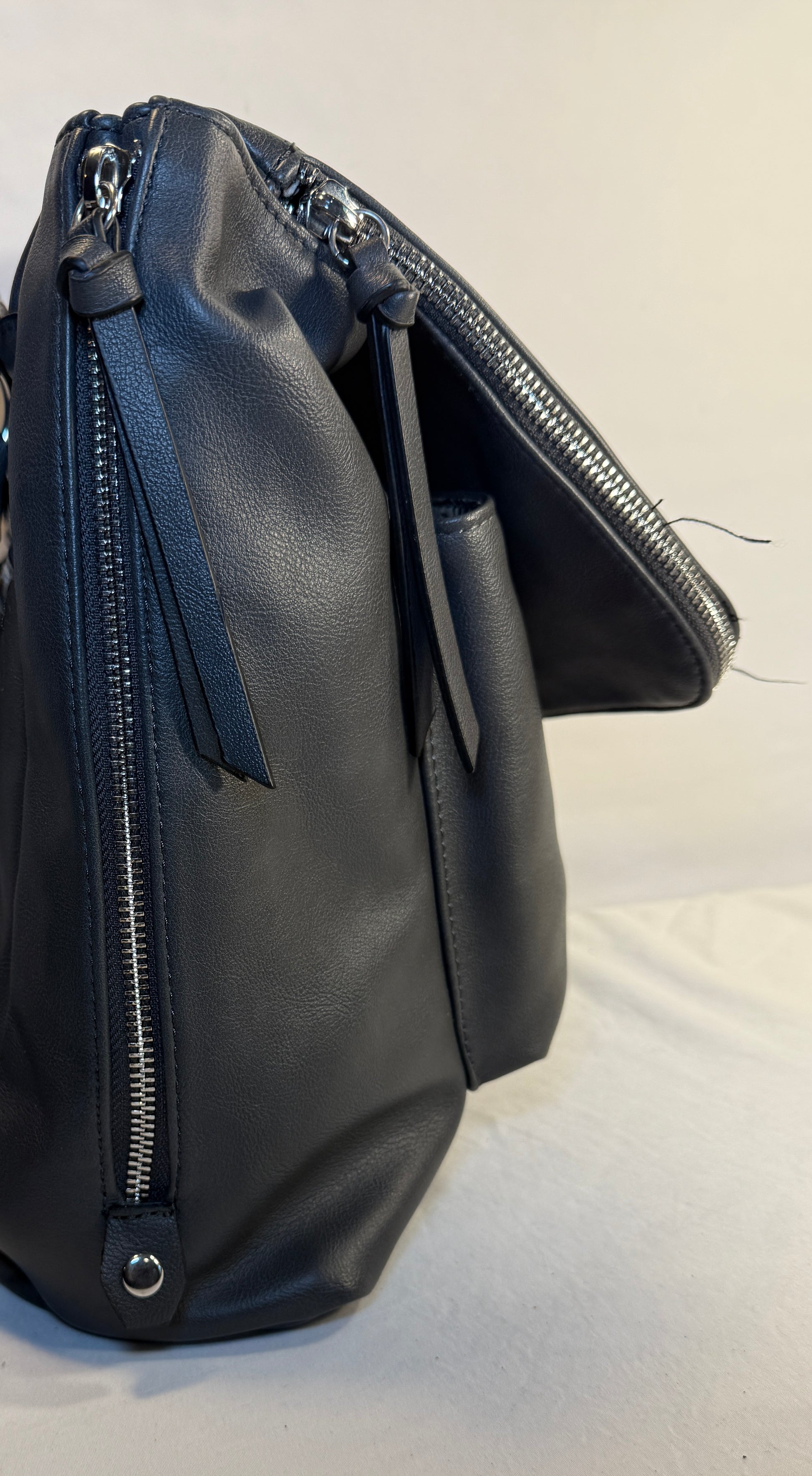 | Versatile bag can we worn as backpack, crossbody or shoulder bag. Magnetic snap closure w/silver hardware. Dimensions: W 10" x H 11 .5" x D 3.5. |