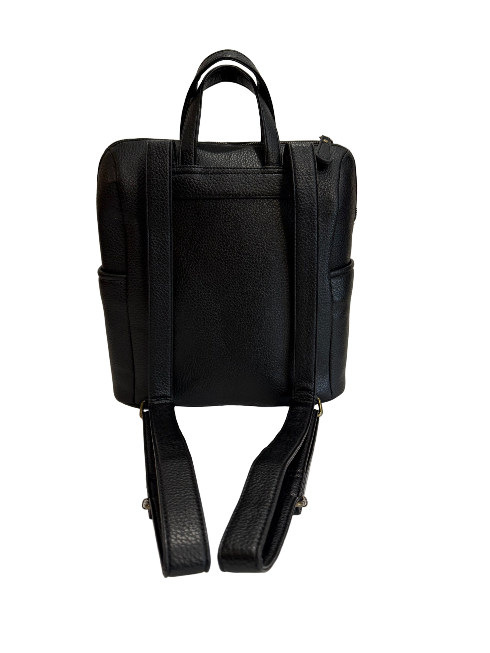 Black Backpack w/adjustable straps. Vegan Material. 3 external zipper compartments w/2 side pockets; zipper compartment inside with 2 pouches. Dimensions: W 11" x H 11".