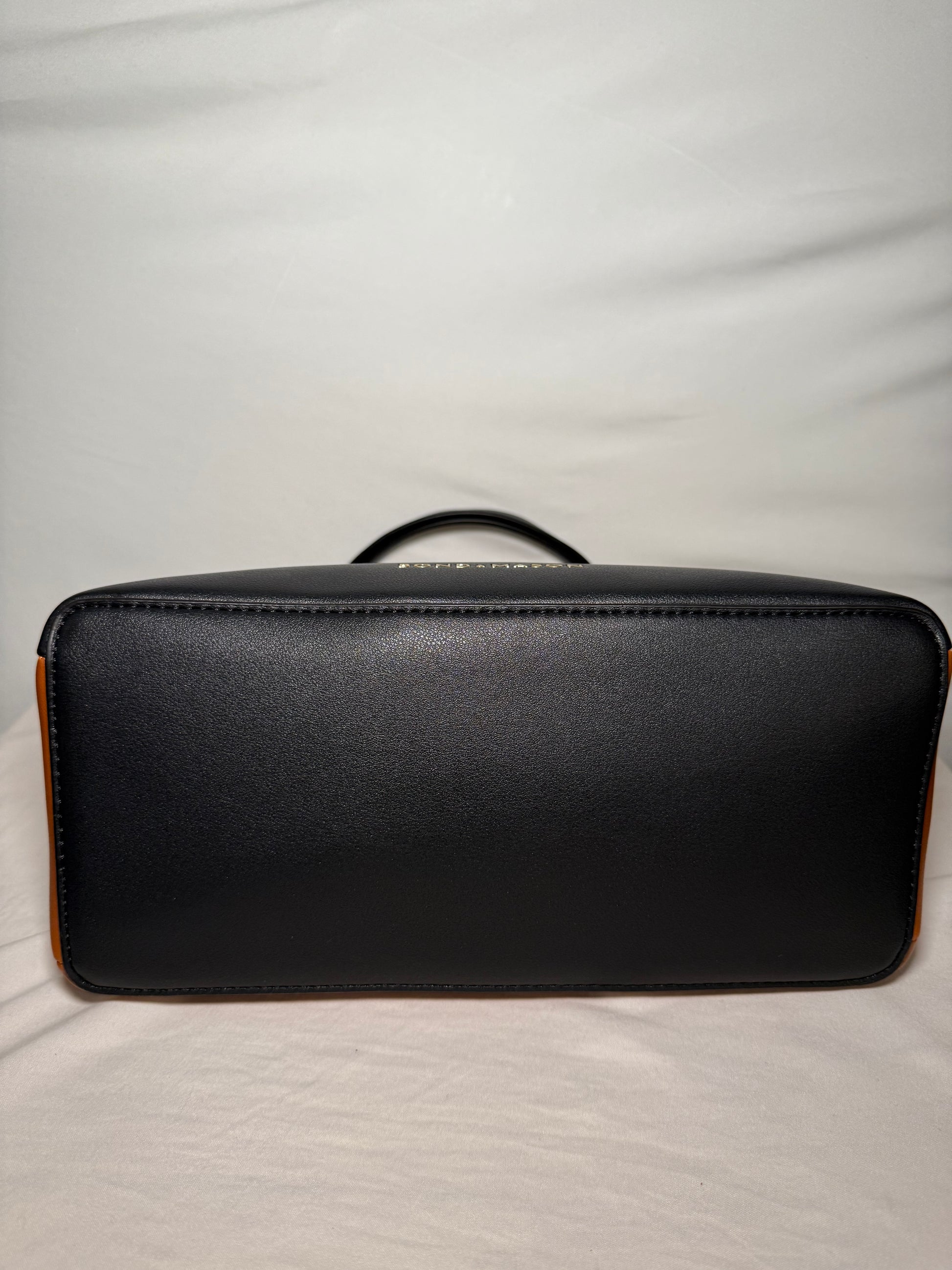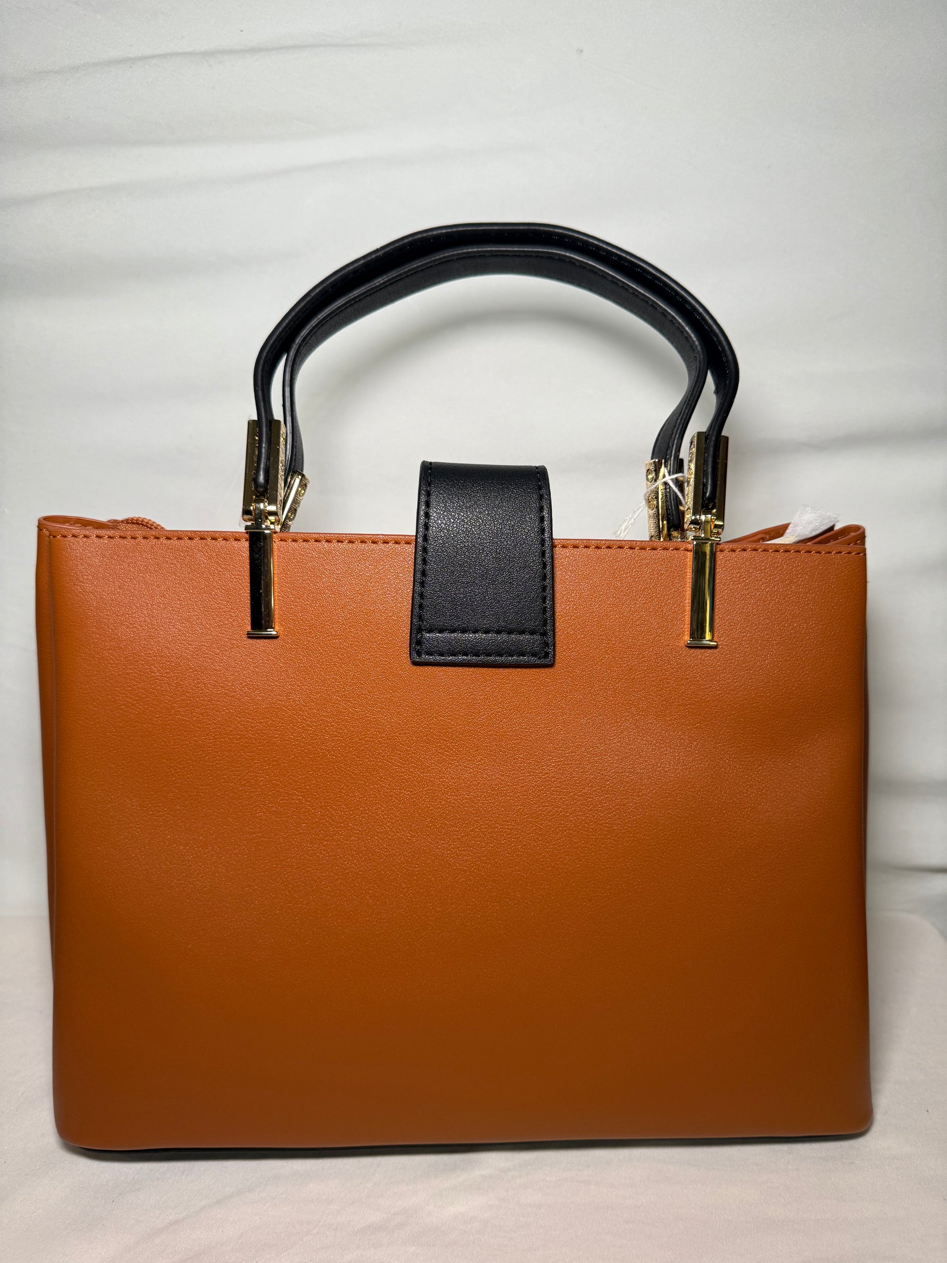 Brown/Black Tote Shoulder Bag. Crafted from the finest vegan leather. 100% Premium Vegan Leather. Interior Lining: Soft fabric. Gold-tone hardware. Dimensions: W: 30 cm/11.75" X H: 32 cm/12.5". Interior details: 2 compartments, 1 zip pocket.