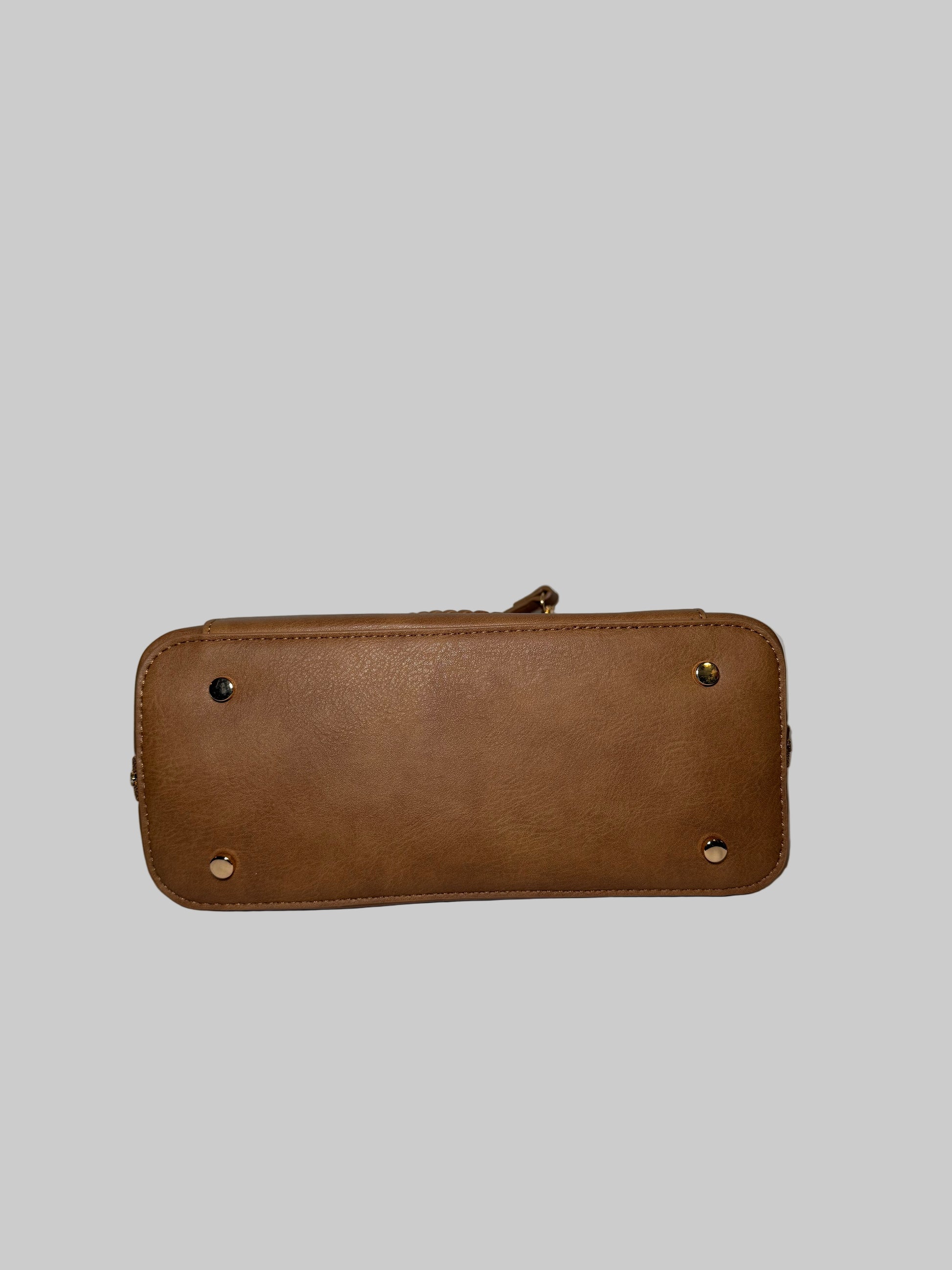 Brown Faux Leather Bag With Shoulder Strap & Braided Top Handle. Adjustable Strap. Bottom Studs, Inner Dividers, Inner Pockets. Size Medium. Bag Height 9 in. Bag Width 11 in. Bag Depth 5 in.