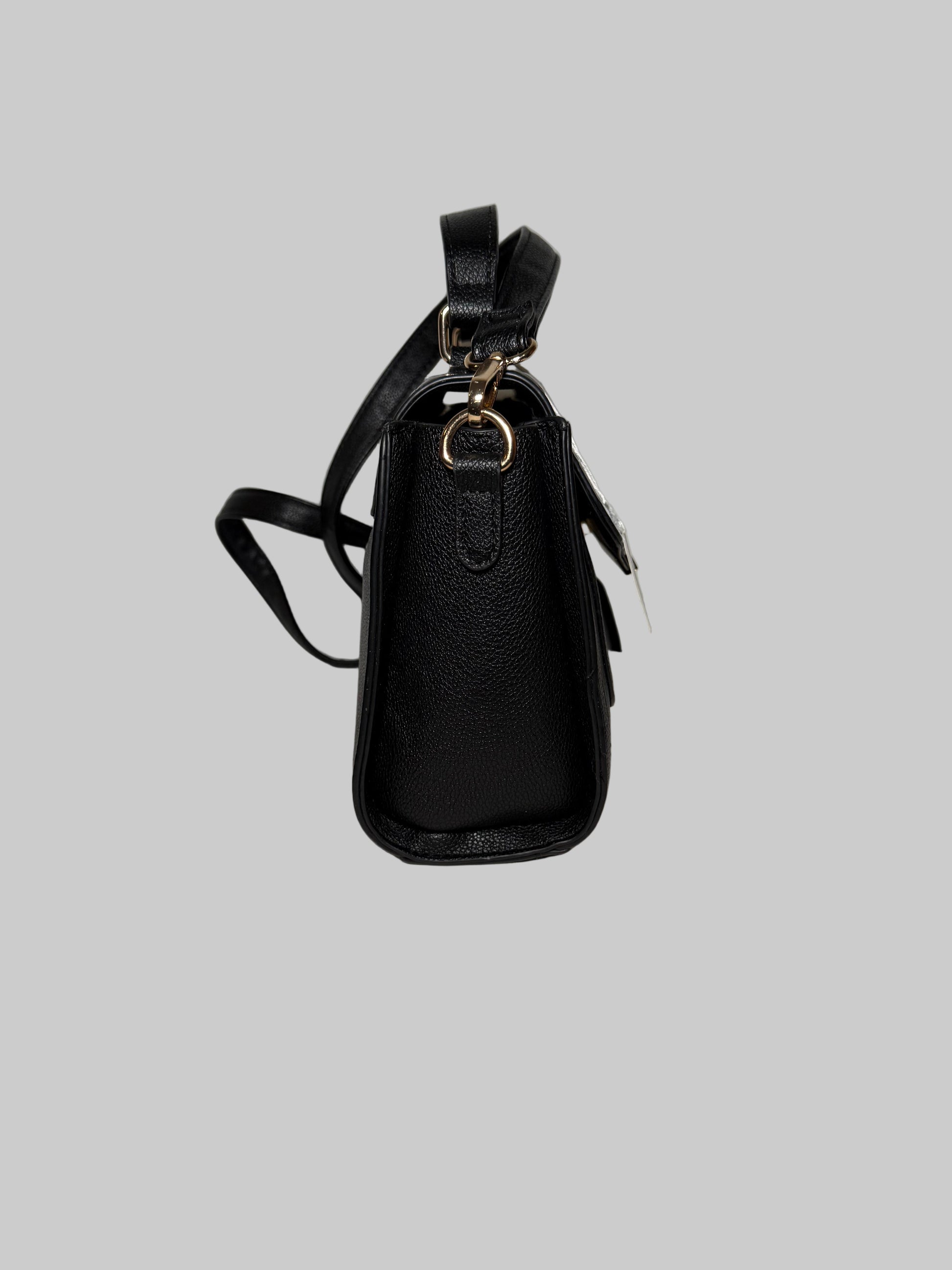 High-quality vegan leather. Gold-tone hardware. Crocodile embossed. Measurements: 9.45 W x 6.3 H x 3.5 D. Handle Drop: 3. Detachable and Adjustable strap extends to 25. Interior features a wall zip pocket, two slip pockets. Exterior details: a front slip pocket and back zipper pocket. Magnetic snap fastening. Fabric Lining.