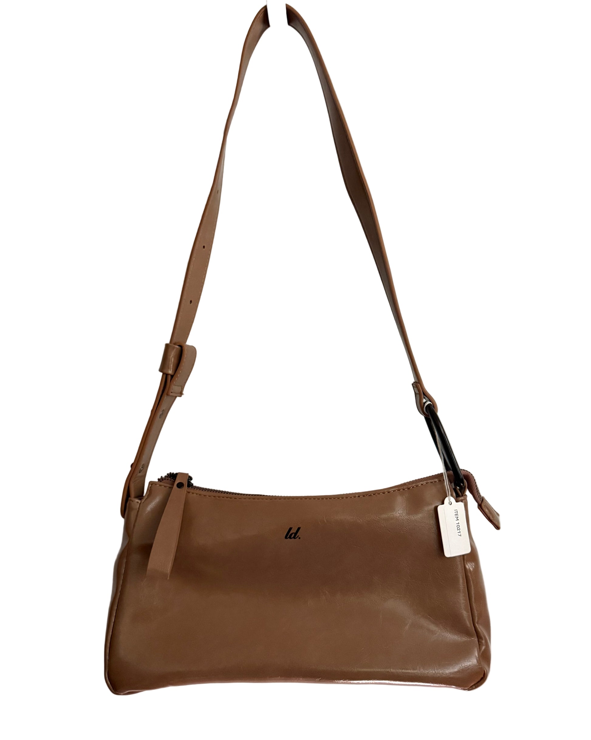 Small Crossbody/Shoulder Handbag Tan w/Adj Strap; Faux Leather; Zip closure. Dimensions: Approx. W 11" x H 6".