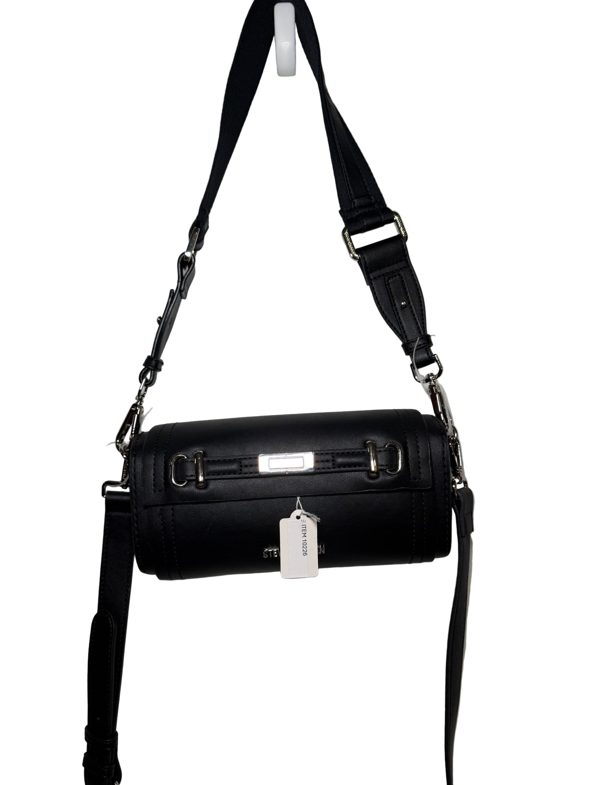 Steve Madden Cylinder Black Leather Shoulder/Crossbody Bag. The bag is structured as a cylindrical shape made from PU leather. Adjustable/Removable Strap. Flap over closure. Approx. Dimensions: W 8.5” x H 4”.