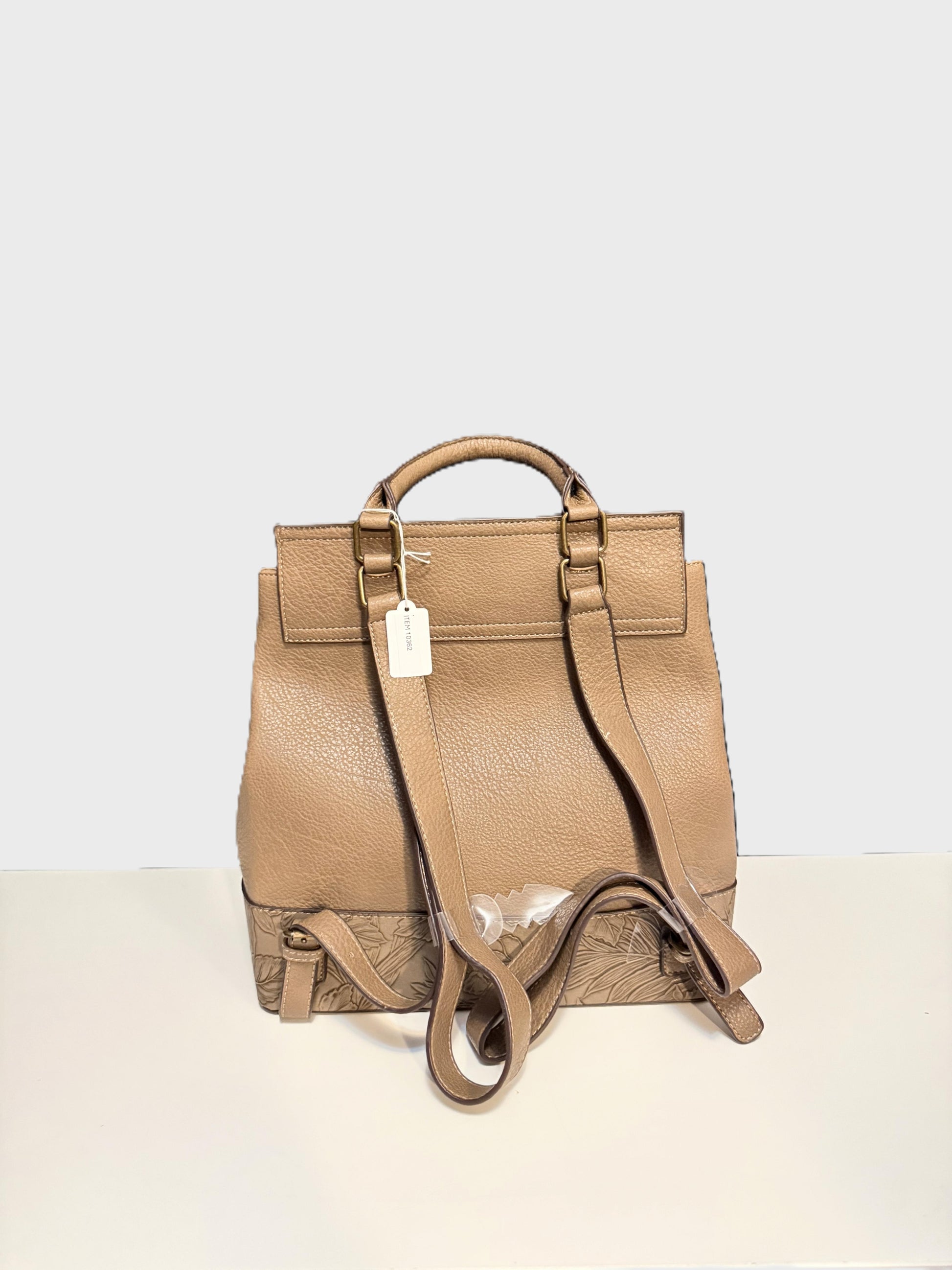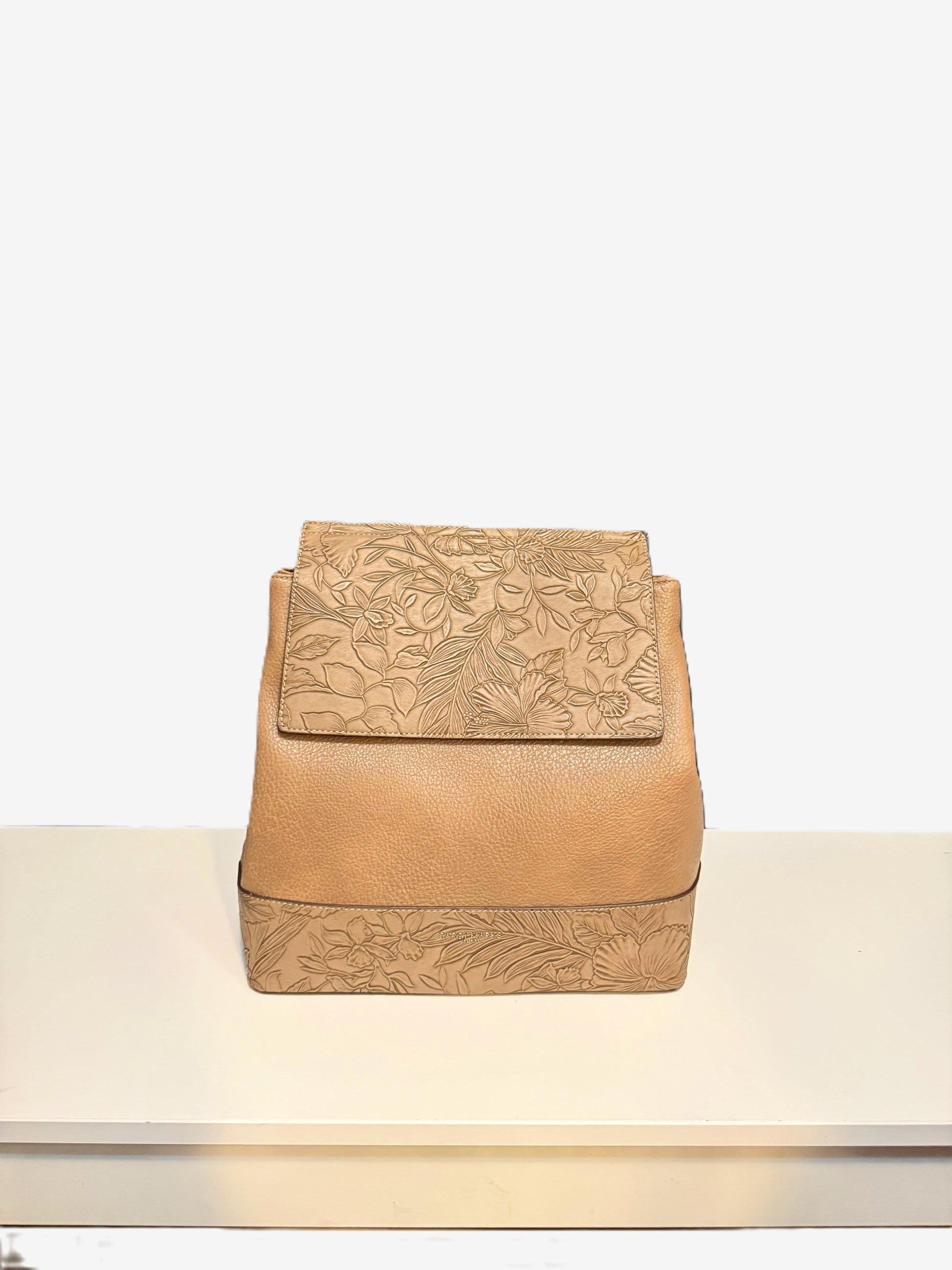 | Vegan leather backpack floral design. Inside zipper divider with zipper Pouch and two side pockets inside. Zipper pocket on outside. Magnetic closure 13 × 13 x 5.5 . |