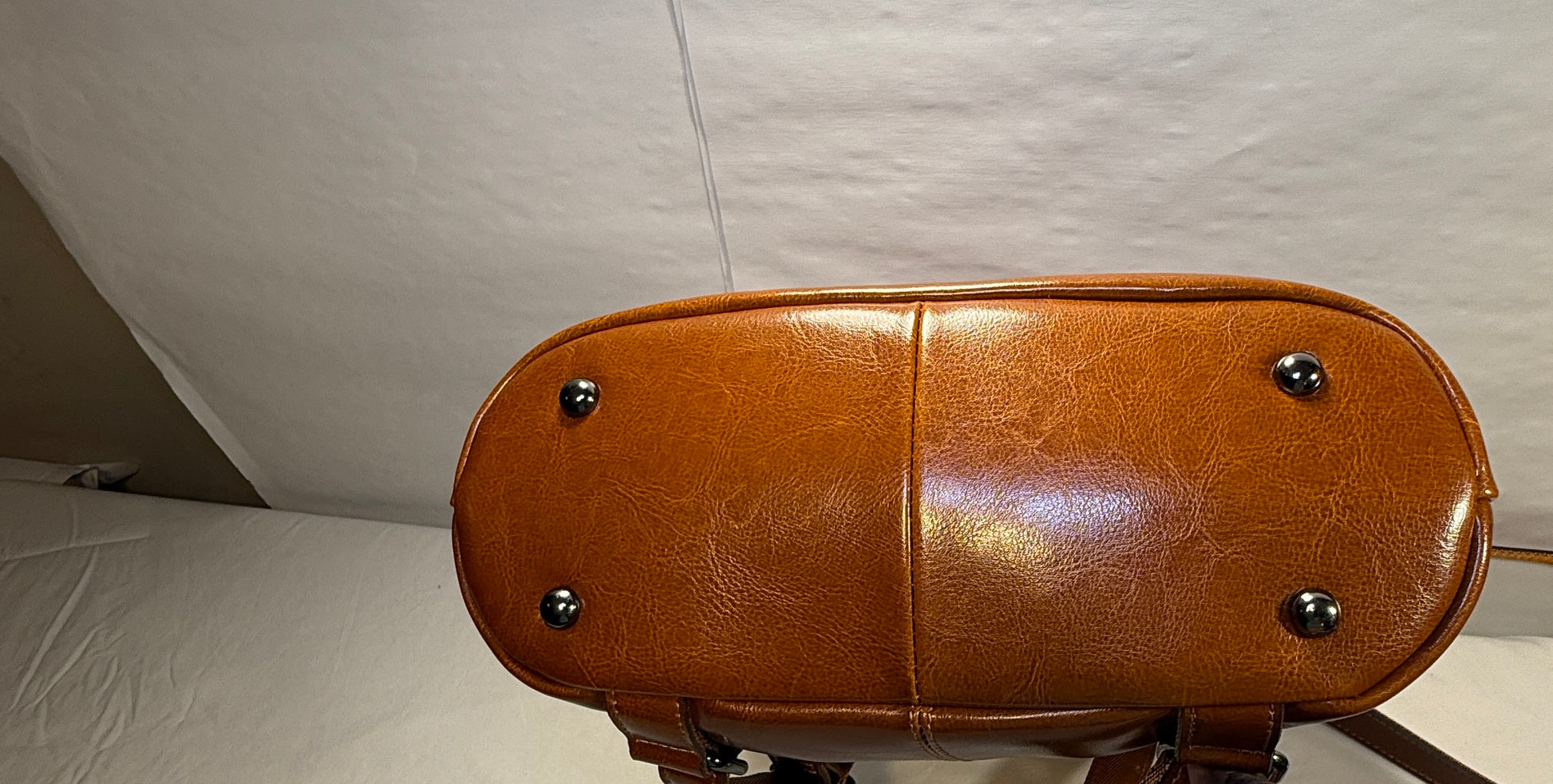 Brown cowhide and man-made leather. Front and rear zipper pockets. Adjustable strap. Dimensions: (L) 11.41" (H) 13.38" (W) 4.52"