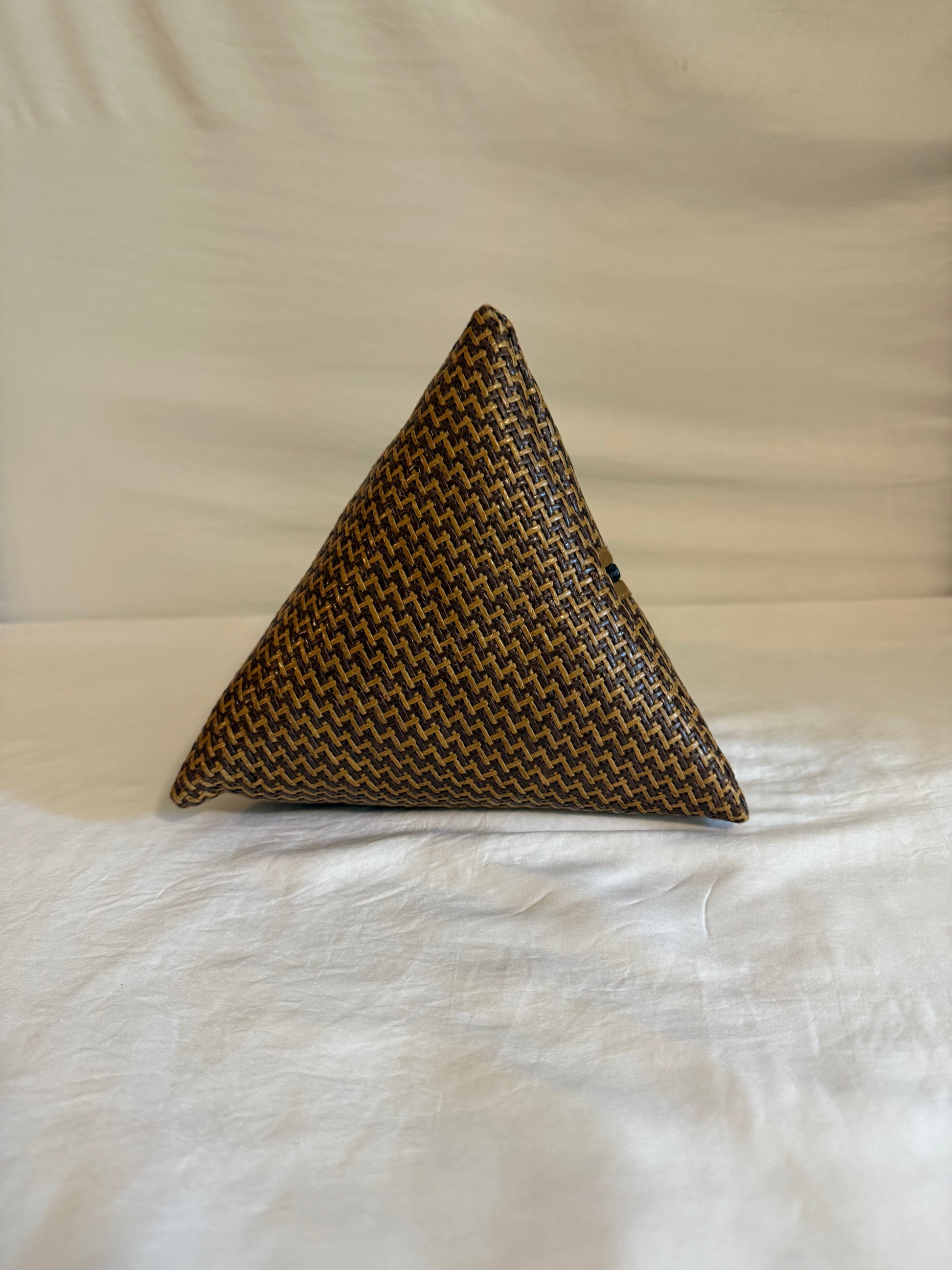 Triangle shaped weaved pattern clutch.Crafted exclusively from natural, sustainably sourced bamboo and wood. Approx. Dimensions: W 7.5" x H 7.5"