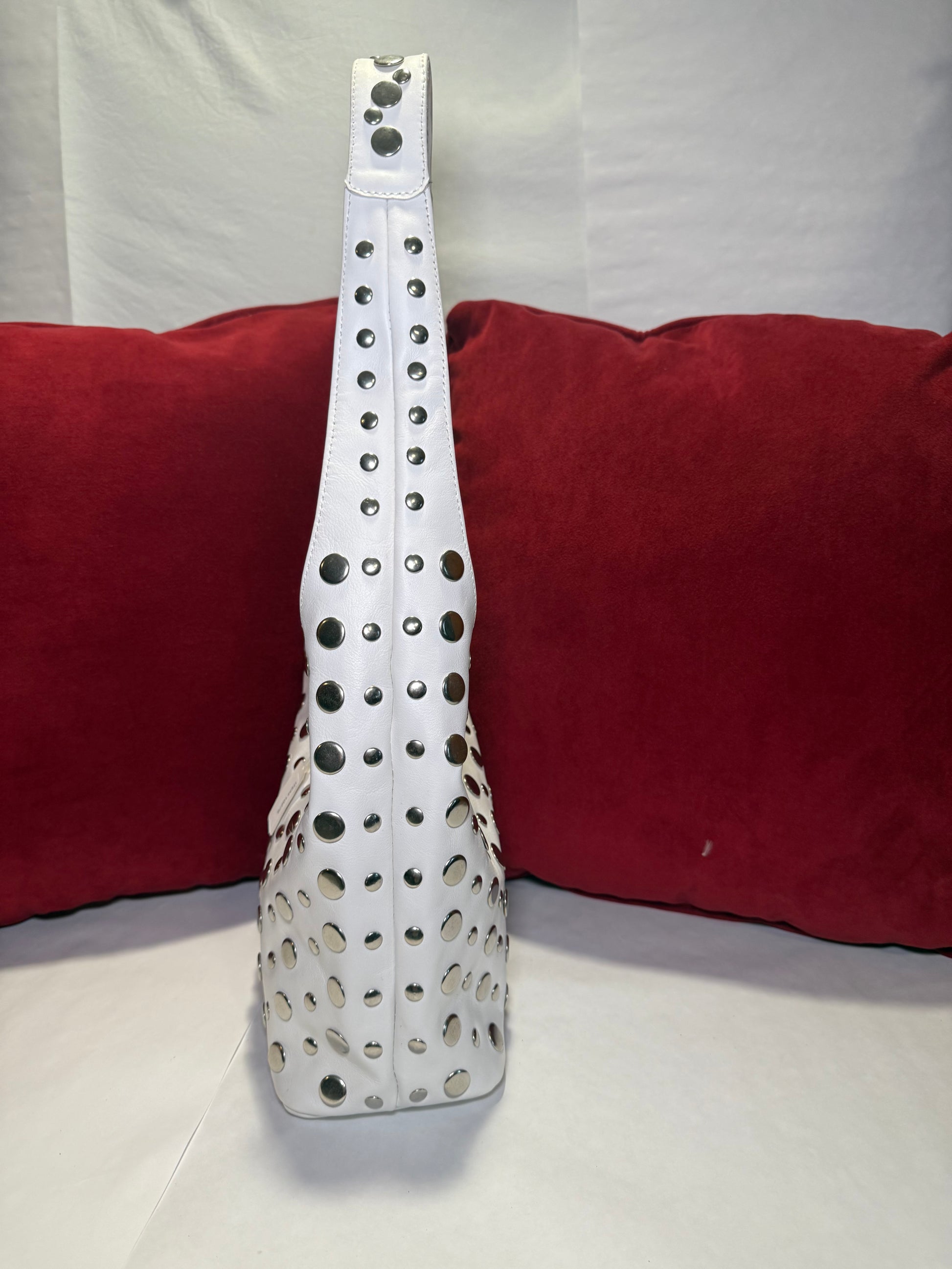 Handmade Moroccan Leather Tote Bag. Material: 100% Goat leather. Lining: Fabric Suede. Magnetic snap. 2 open pockets and 1 zippered pocket inside. Size: W 7”x H 7”. Strap Length: 24”
