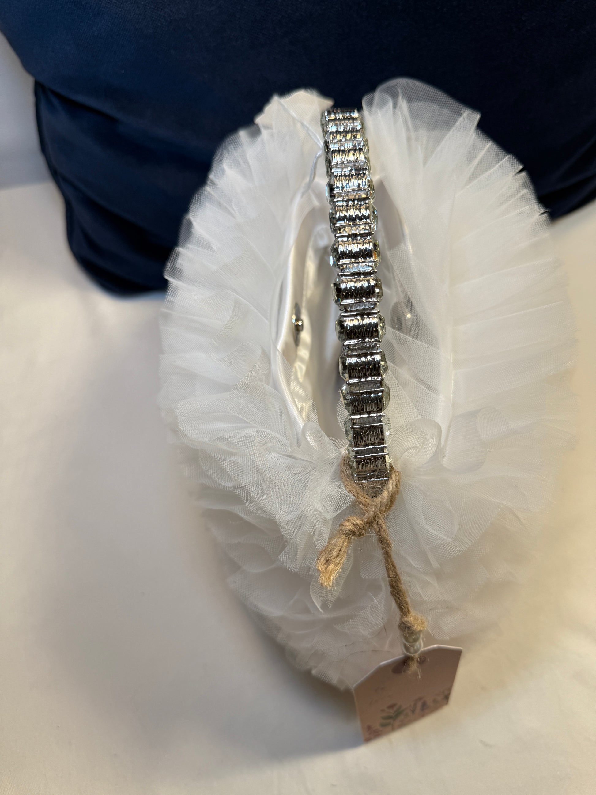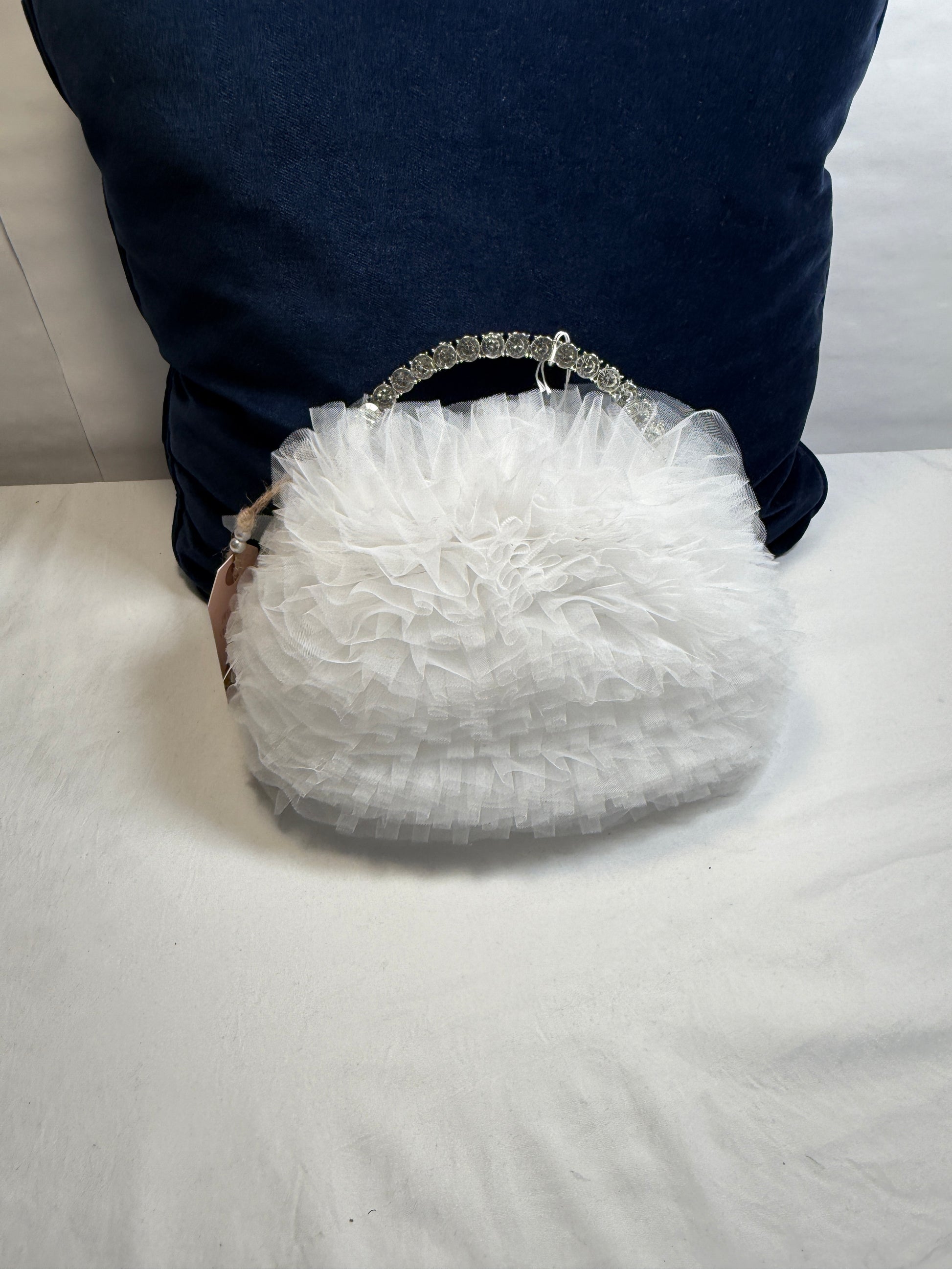 Jewel by Badgley Mischka Delilah satin sash bow bag in white. Silver Metal Hardware. Chiffon Ruffle Pouch Clutch Bridal. Magnetic closure. Mini