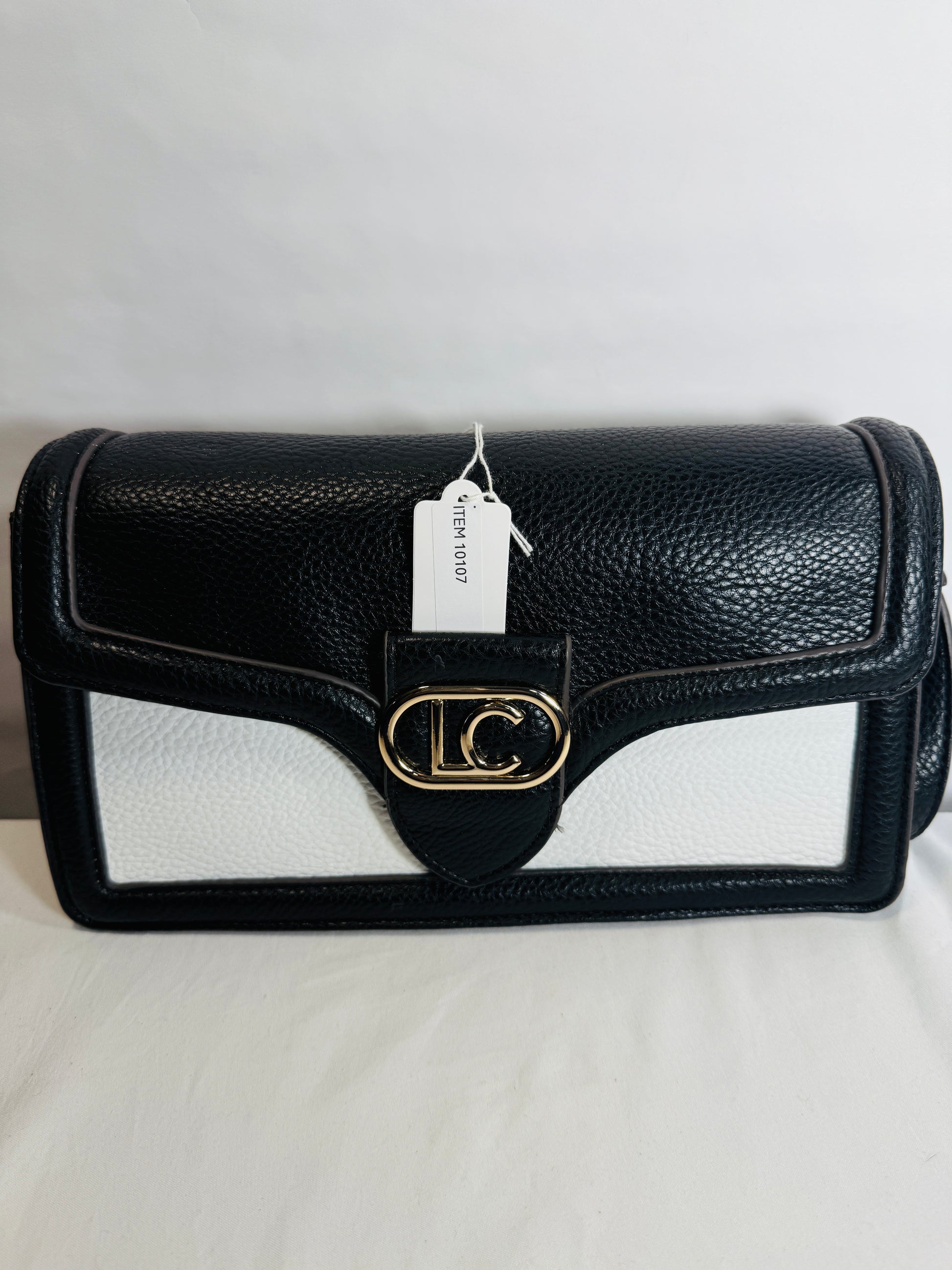 Liz Claiborne Faux Leather Crossbody Bag. Flap-style bag has an inside zip pocket, a back slip pocket for easy access, a magnetic snap closure, and an adjustable strap. Black/White color. Dimensions: W 10" x H 5.75" x D 2.5".