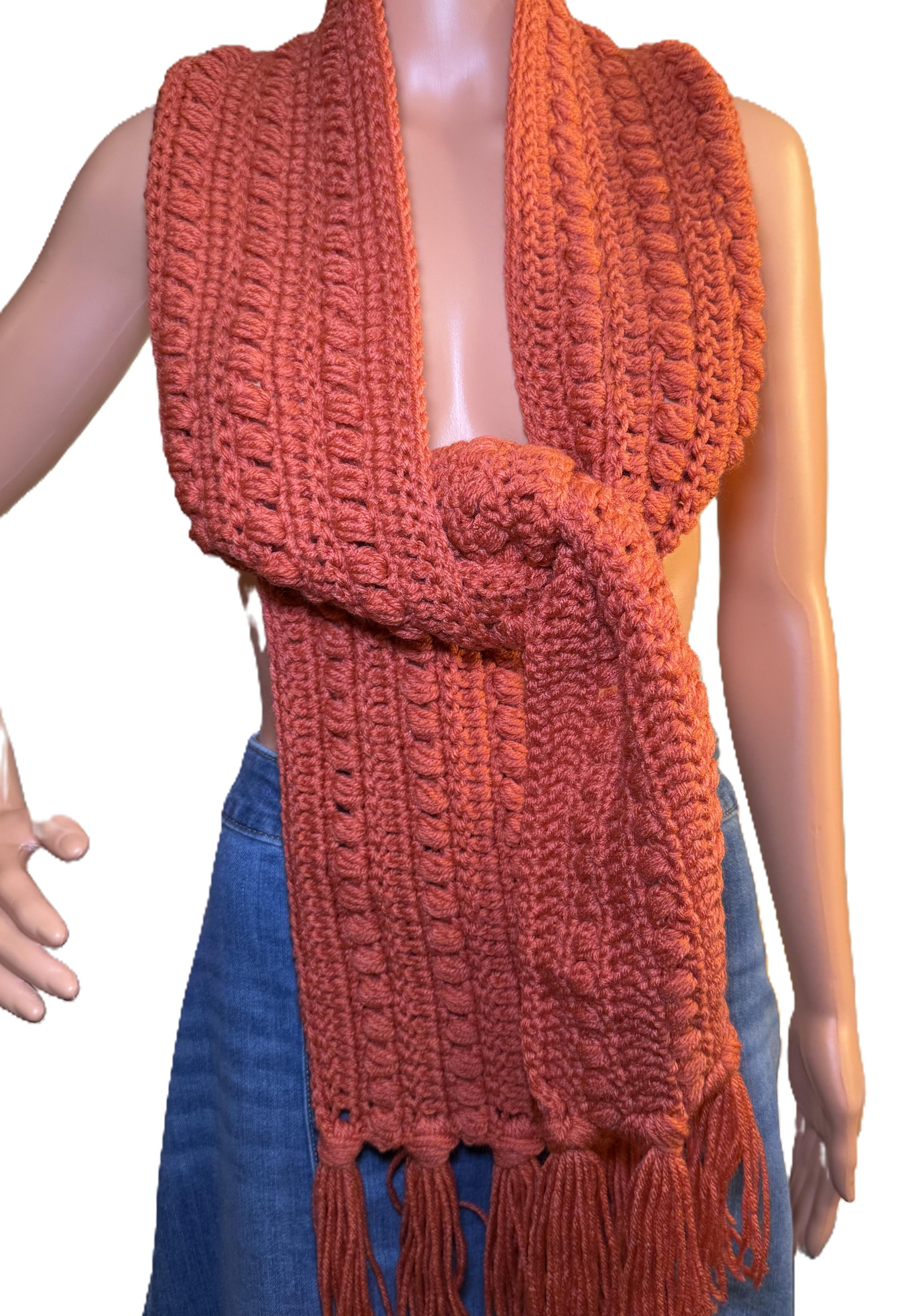 Handmade Crochet Scarves. Size varies per customer. Crocheted by hand with lightweight, durable acrylic yarn or cozy wool-blend that retains its shape and color. Visit FACEBOOK #ARKAYESSDESIGNZ. Made To Order.