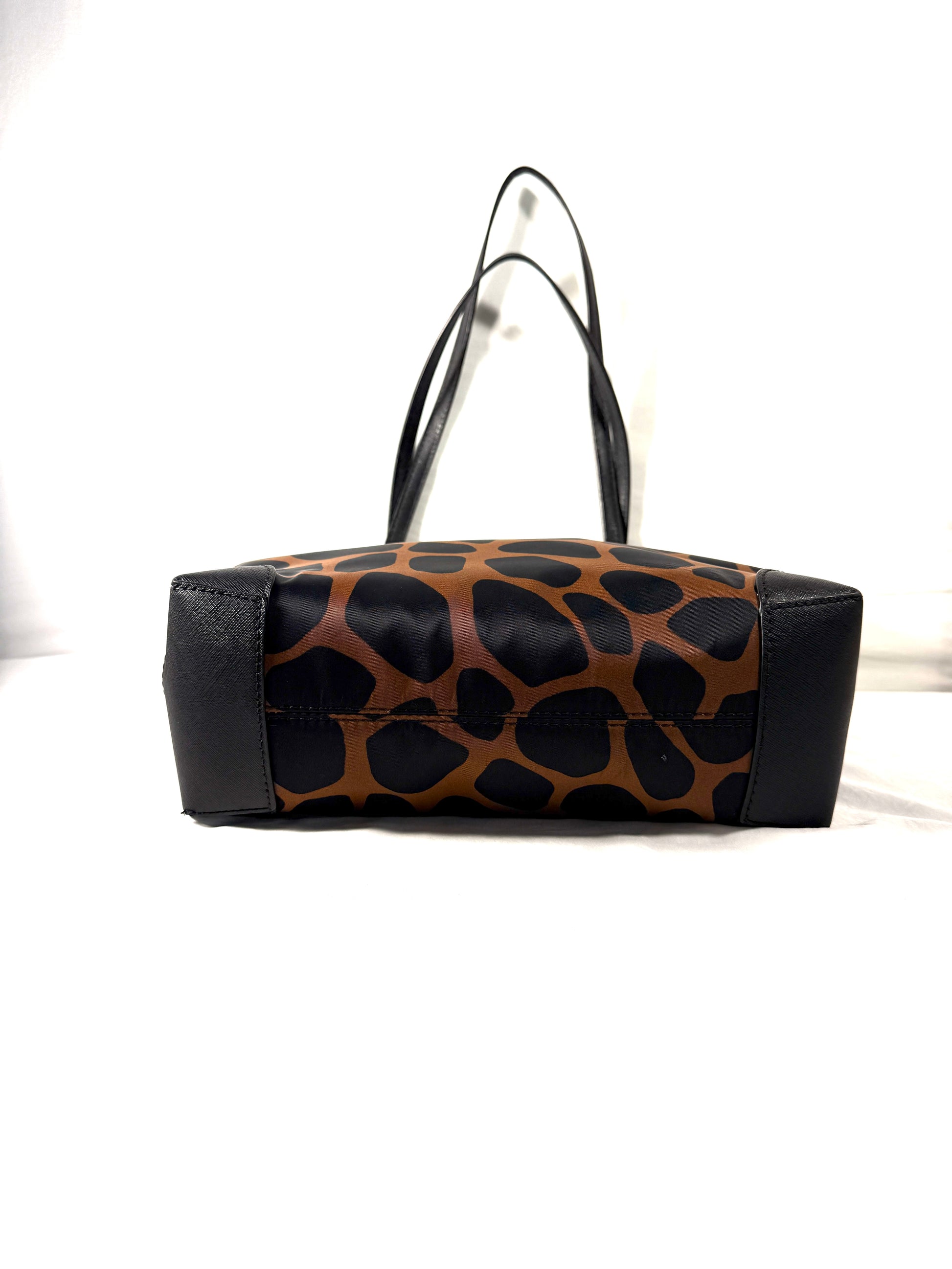 Michael Kors Eva zip nylon shoulder tote giraffe print. 18-1/2"W x 11"H x 5-1/4"D (width is measured across the bottom of handbag. 87% polyester, 12% polyurethane, 1% acrylic; lining: 100% polyester; trim is leather