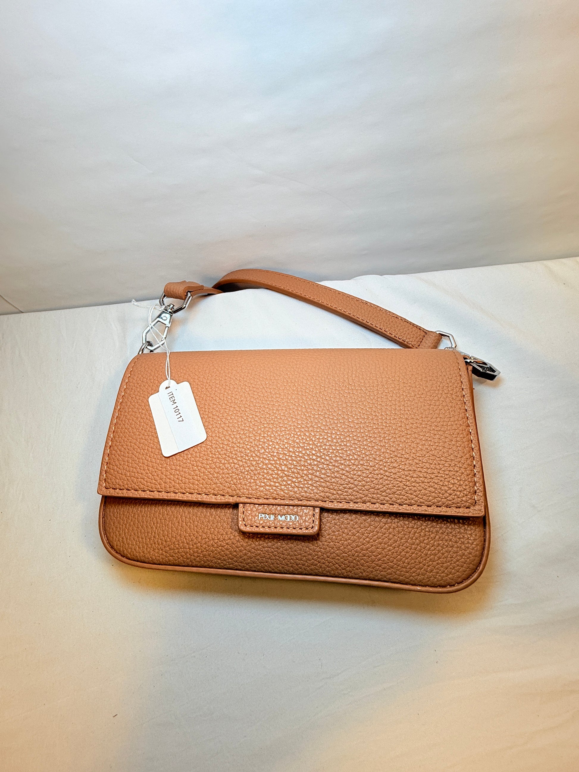 Mini Crossbody bag w/adjustable strap. Foldover flap with magnetic button closure. Vegan leather. Dimensions: L 8.20" x H 4.92" x D 1.42".
