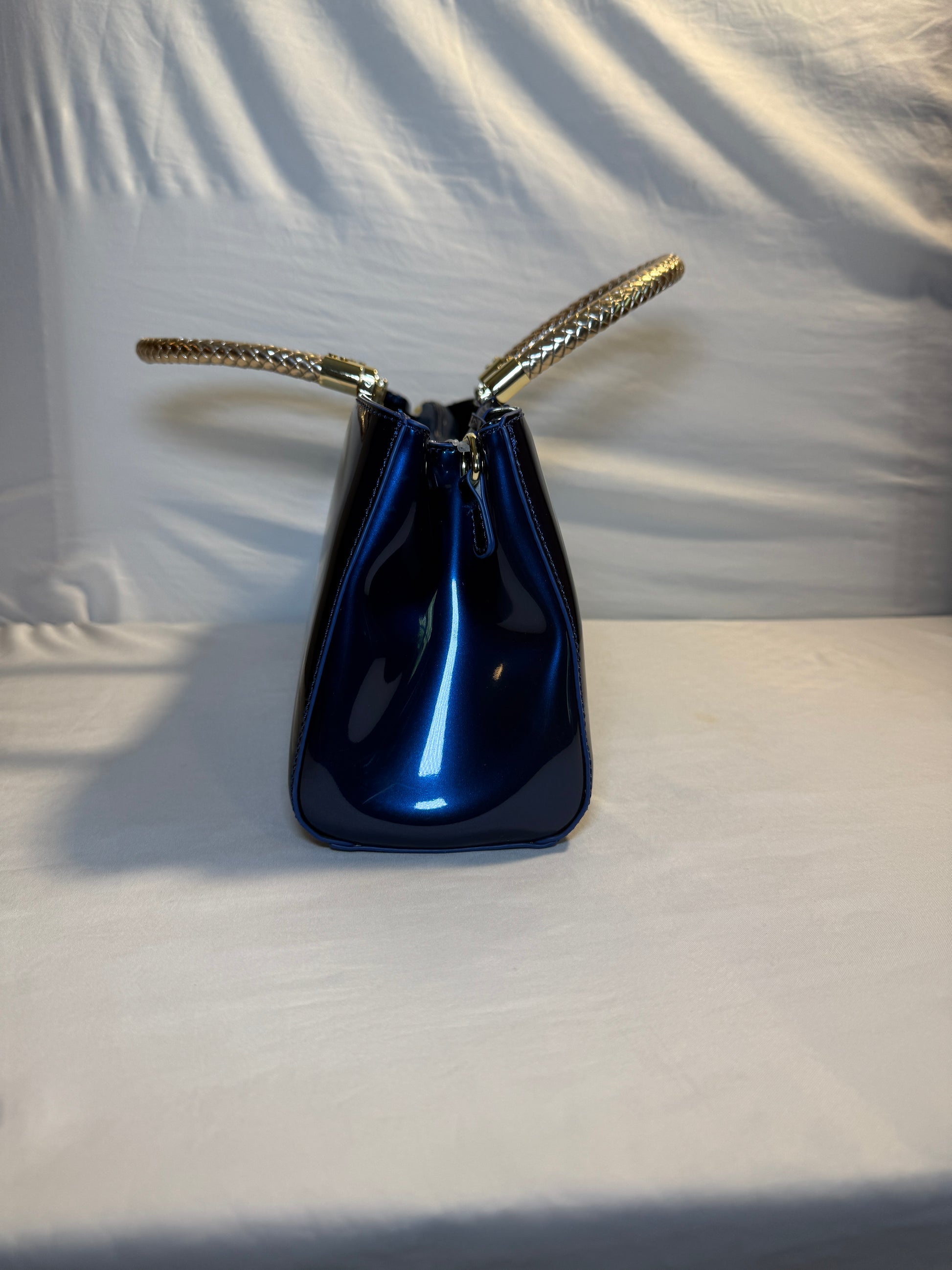 | Glossy Faux Patent Leather handbag. Material: PU leather and polyester fiber w/metal handles. Shoulder strap is removable and is adjustable up to 1.2”. Product Dimensions : 13.39 x 4.33 x 5.91” |