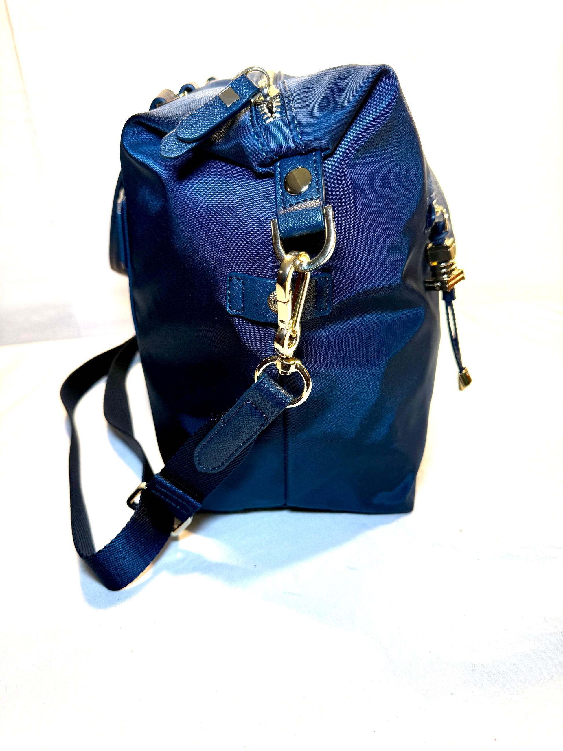 Samsonite Nylon Tote/Shoulder Duffle Bag. Designed as a stylish and functional travel duffle. Made of lightweight nylon with vinyl trim and features multiple compartments, including a main compartment and exterior zippered pockets for organization. Approx. W 17" x H 13".