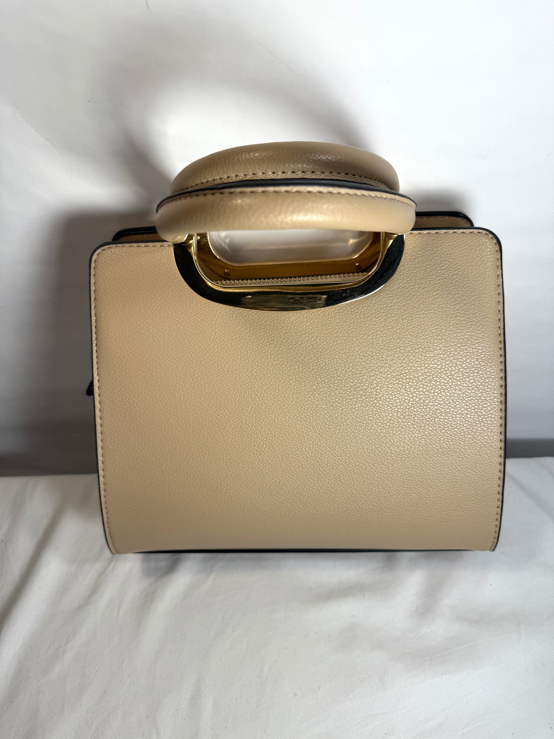 Small Faux Tote/Shoulder Bag w/woven design trim and gold tone hardware.