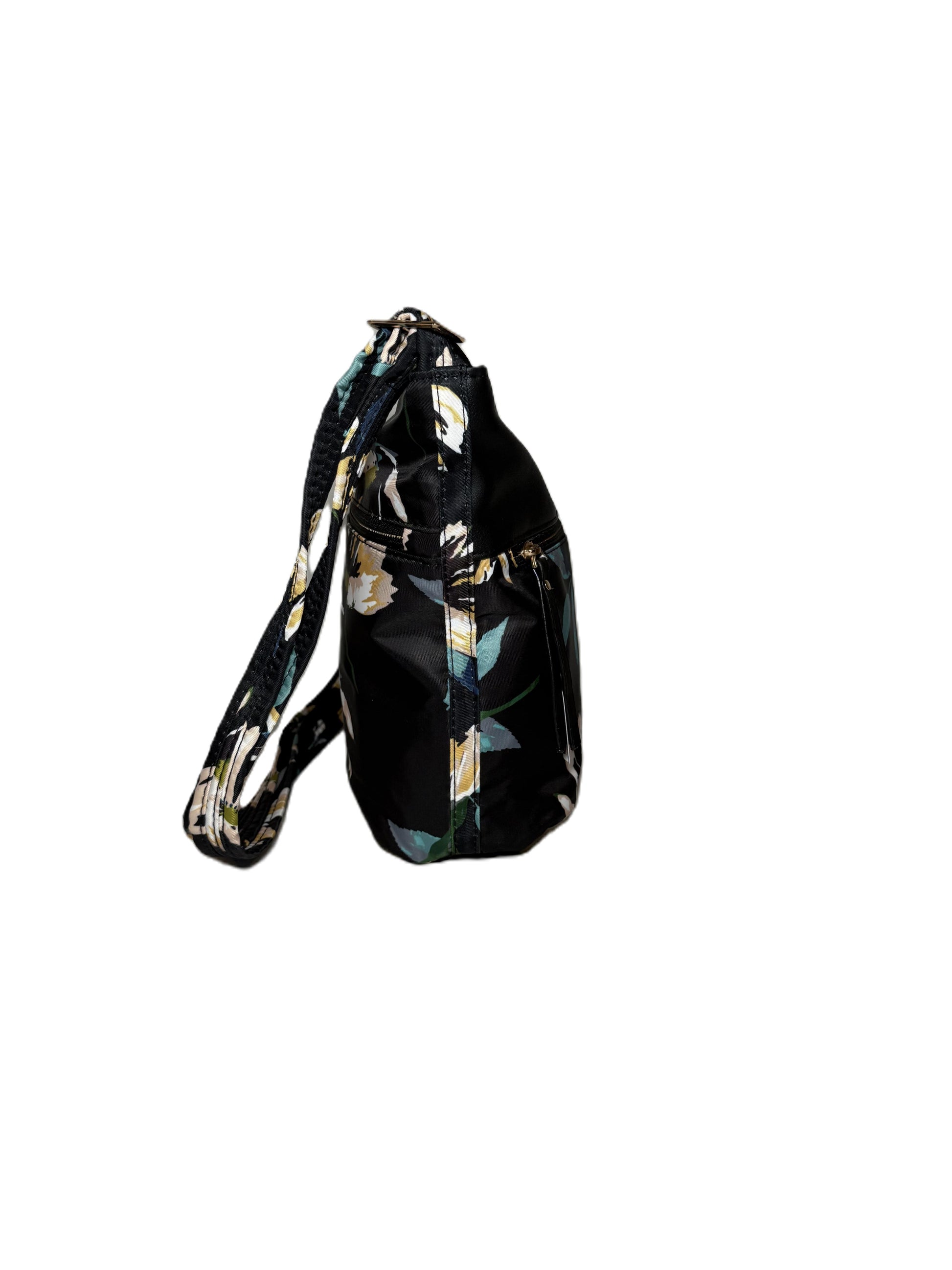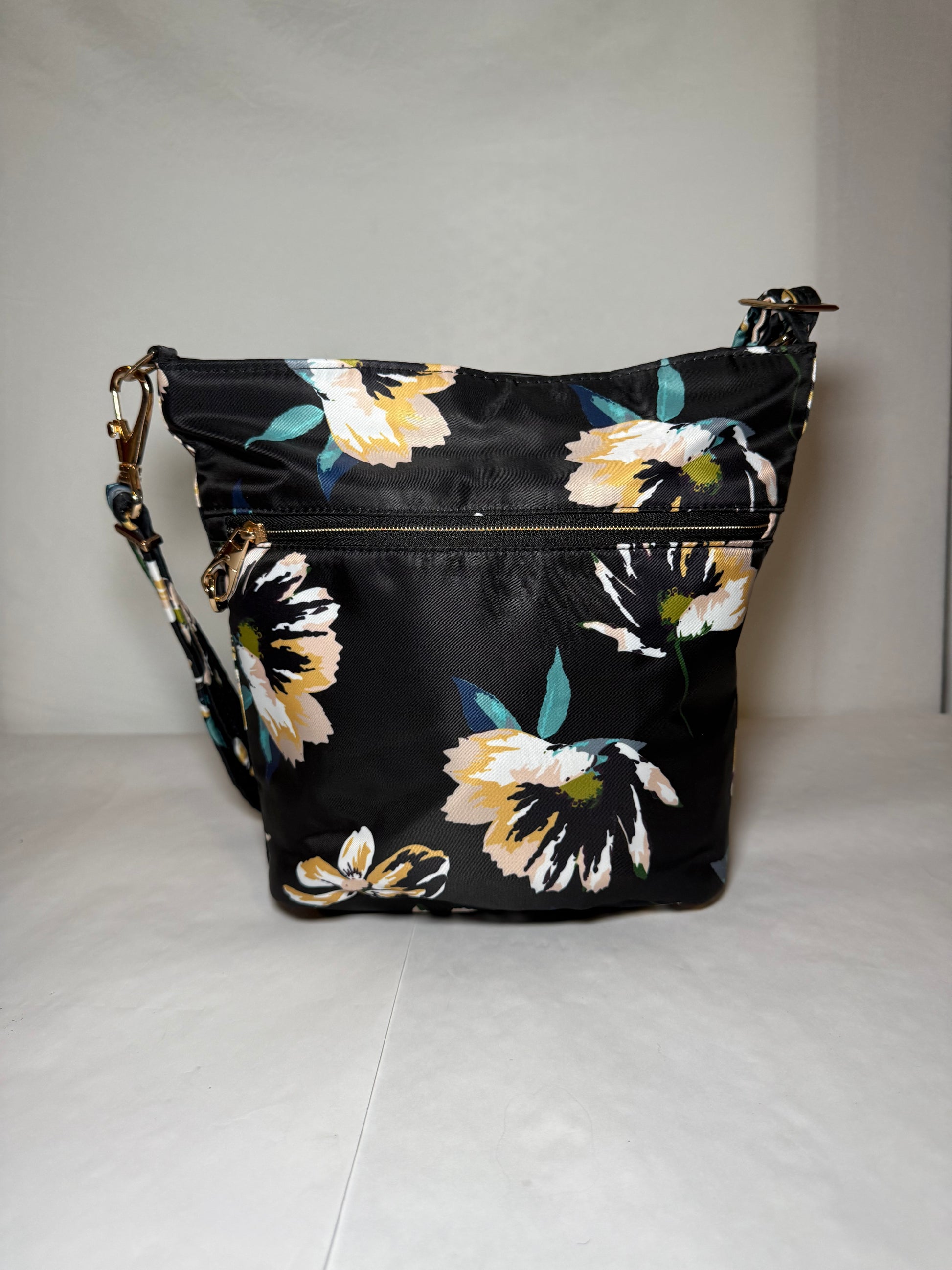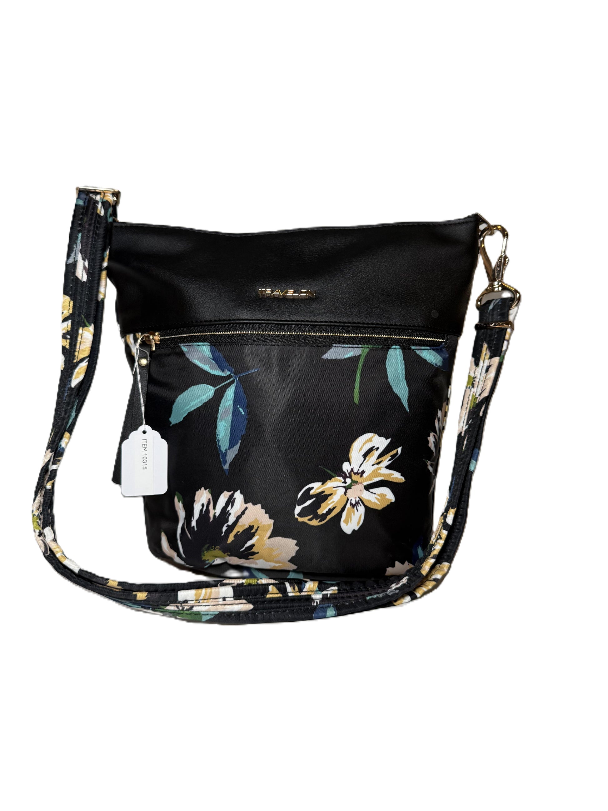 Travelon Addison Anti-Theft Bucket Bag. Nylon and Vegan Leather. Zipper Closure. Main compartment has an organization panel, zippered pocket. 5-Point Anti-theft security system helps prevent the 5 most common types of pedestrian theft.