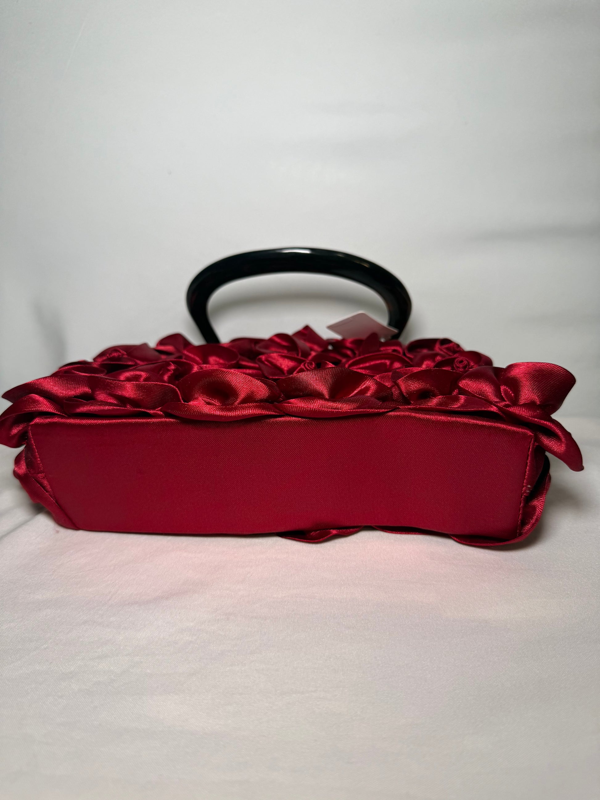 Vintage Red Satin Roses With Retro Handle. Magnetic Closure. Clutch. Satin Bag . Approx. Dimensions: Bag Length 6 3/4”. Depth 6 3/4”