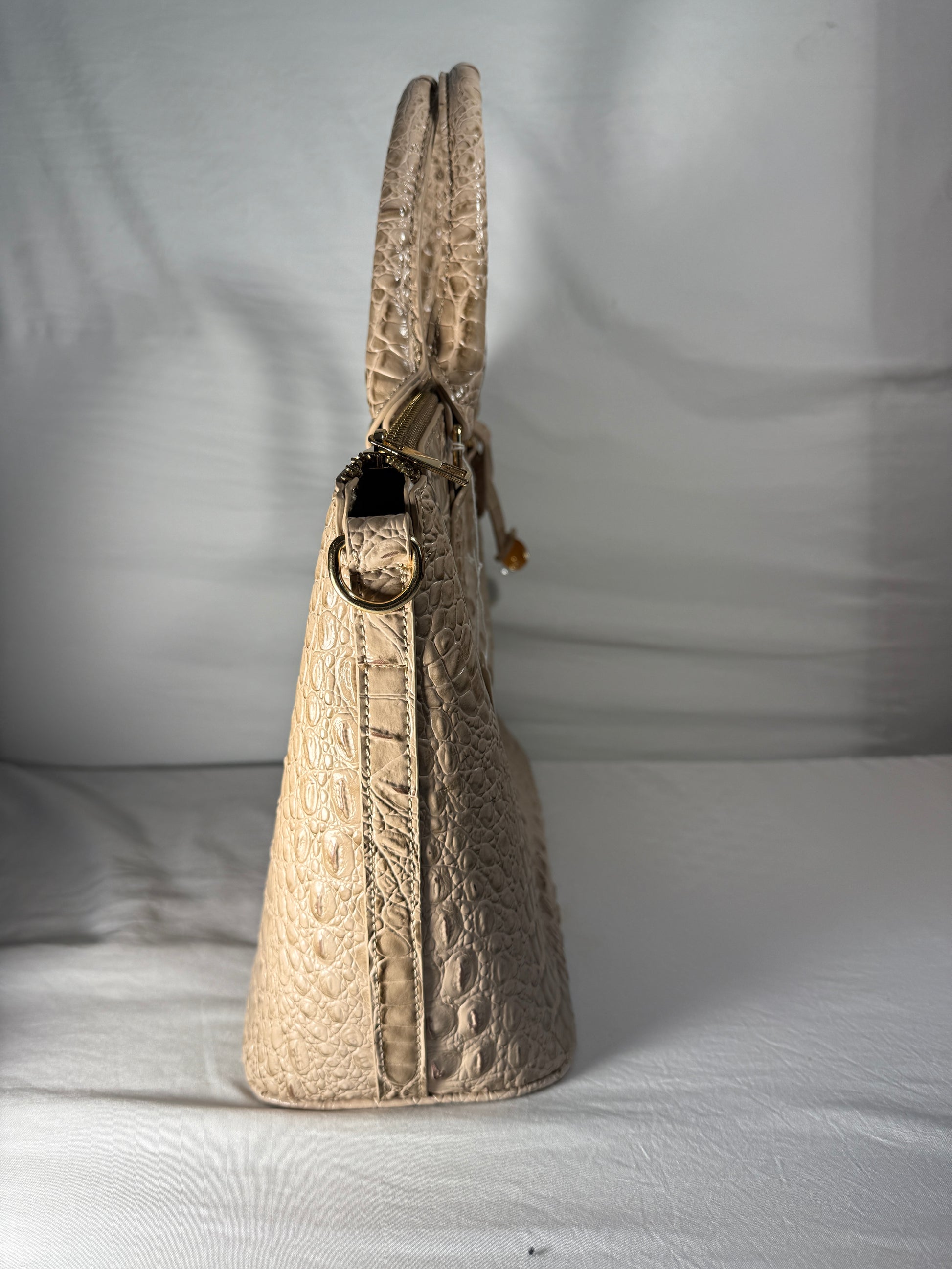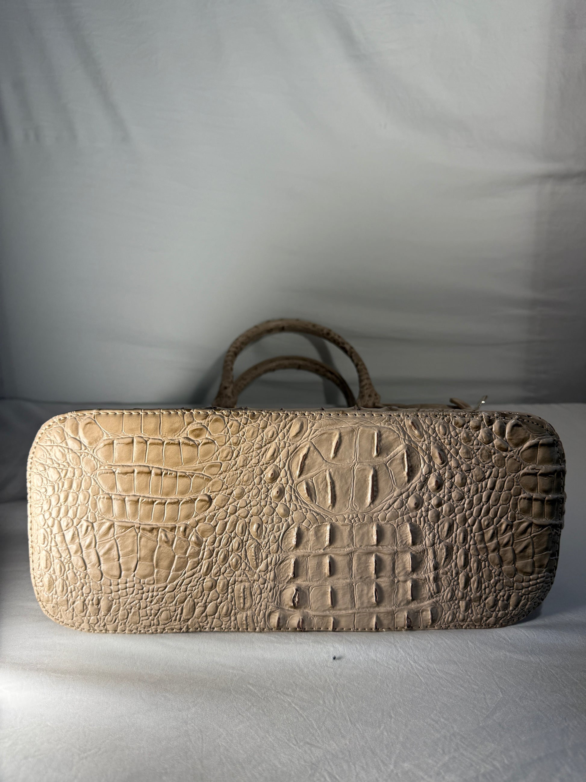Water-resistant, and scratch-resistant faux leather with a crocodile print. Top-handle/Crossbody/Tote. W 11.8” x H 5.1”.
